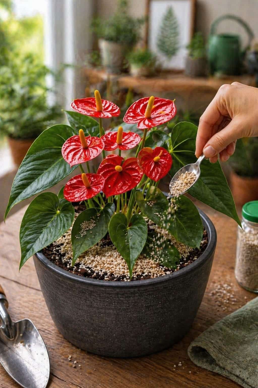 Anthuriums are not heavy feeders, but they do need consistent nutrition to produce those iconic flowers. A slow‑release fertilizer provides: