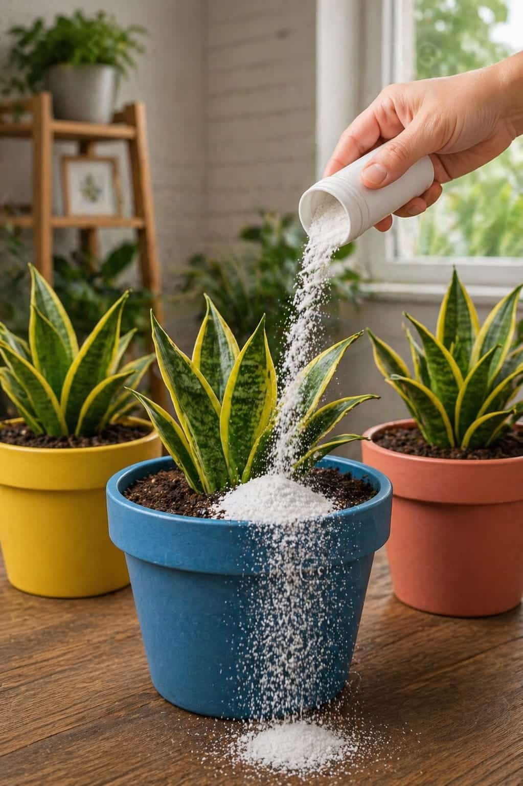 However, there is one very important warning: the white powder should never be poured heavily onto the plant like snow. Snake plants do not need thick layers of powder, strong kitchen chemicals, or constant feeding. A large pile of any powder on the soil can cause problems, especially if it affects drainage, traps moisture, or changes the soil too much. The trick works best when the powder is used lightly, carefully, and only after you understand why the snake plant is weak in the first place.