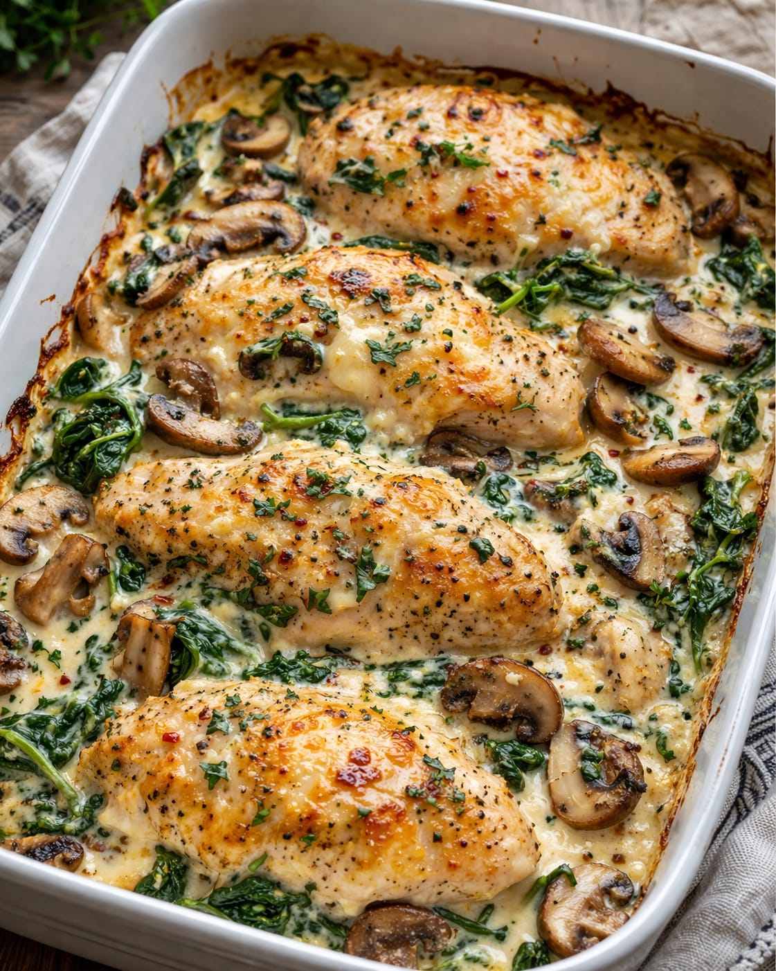 The spinach wilts into the sauce, adding a massive nutrient boost without screaming “I’m a vegetable.” The mushrooms bring earthy depth. The chicken stays juicy because the creamy sauce protects it from the heat. And the Parmesan on top? That’s the golden, bubbly, irresistible finish.