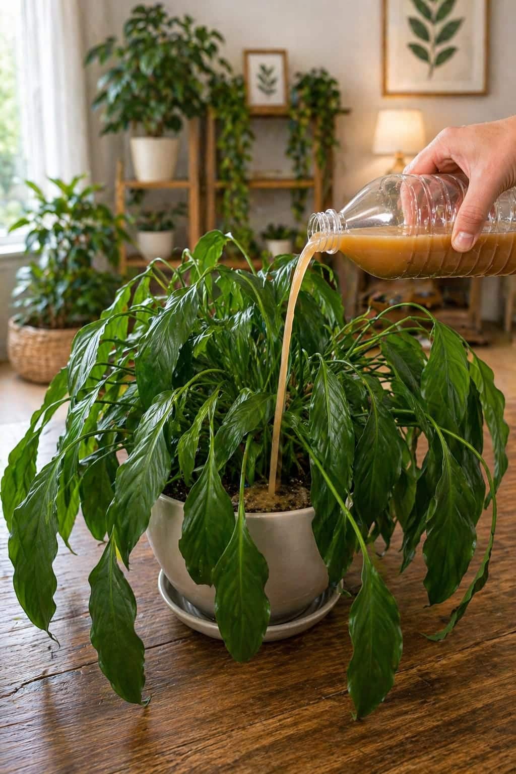 For peace lilies, this method can be useful when done carefully. Peace lilies enjoy slightly moist soil, mild feeding, warmth, and humidity. They are not as drought-loving as snake plants or cacti. A gentle organic drink can fit into their care routine better than it would for many dry-loving plants. However, the brown liquid must be fresh, diluted, and used only when the plant actually needs water. A strong, sour, fermented, or unstrained mixture can create mold, gnats, bad smells, and root problems.