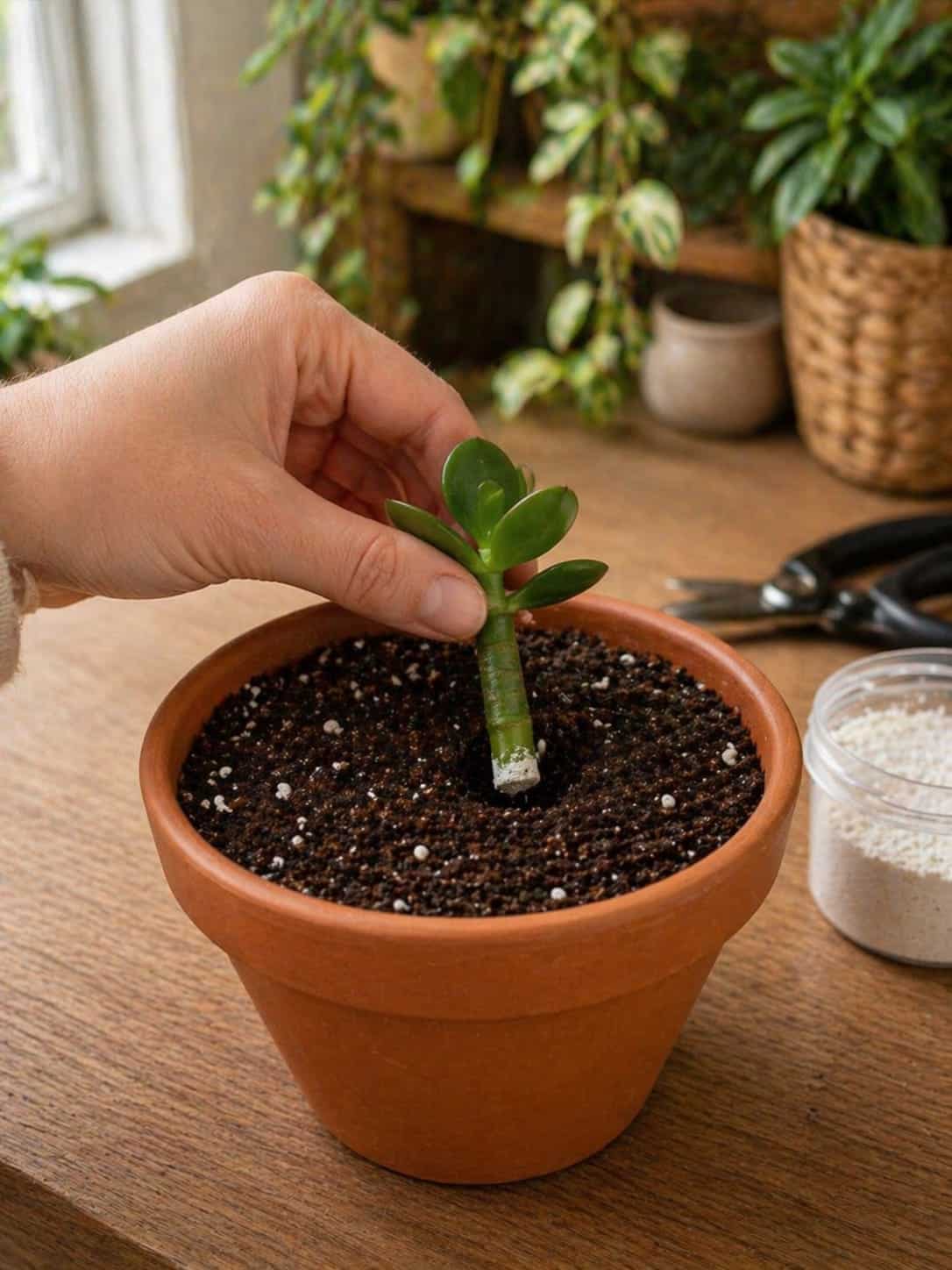 In many propagation methods, you may see a white powder or dry substance being used. This usually represents a drying or protective step that helps the cutting heal before planting. In reality, most successful jade propagators do not use any powder at all. Instead, they rely on callusing, which is the plant’s natural healing process.