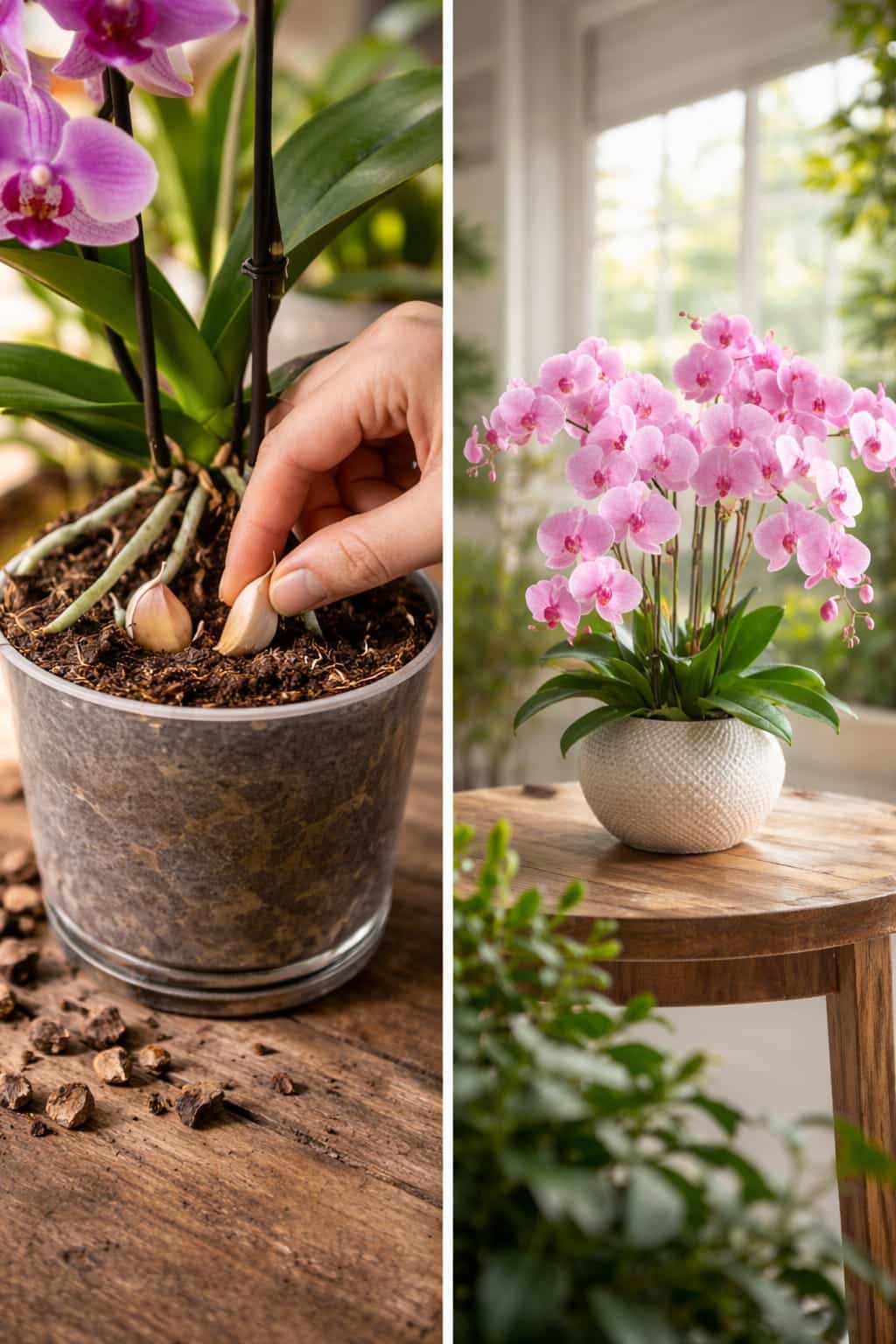 The linked article’s main “reviving” remedy is garlic‑infused water. It describes chopping garlic cloves, steeping them in water for 24 hours, straining the mixture, and then soaking orchid roots in the liquid briefly before repotting. The article frames garlic as a natural antifungal and antibacterial tonic for weak plants.