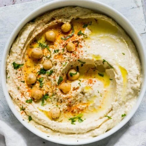 • If serving as an appetizer, spoon the hummus into the center of a wide, shallow serving bowl and spread it out in a thick circle. Sprinkle the parsley and paprika on top, then drizzle with the oil.