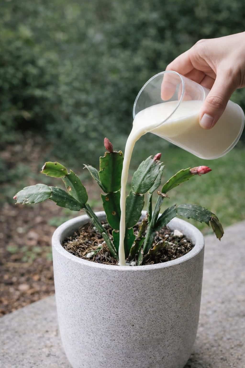 You may have seen videos showing a white liquid being poured into the pot — often milk — with the promise that it keeps a Christmas cactus blooming for weeks. It looks simple, dramatic, and tempting.