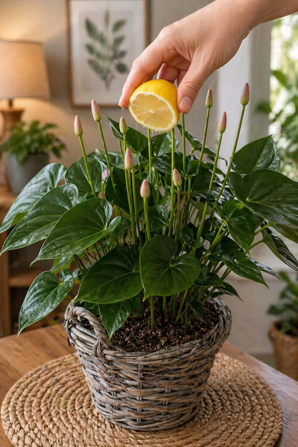 The setup is always appealing: a healthy anthurium already full of buds, a fresh lemon being squeezed over the soil, and a promise of “nonstop blooms” or “instant flowering power.” The visual creates a strong emotional hook. It suggests that one simple kitchen ingredient can replace expensive fertilizers and complicated care routines.