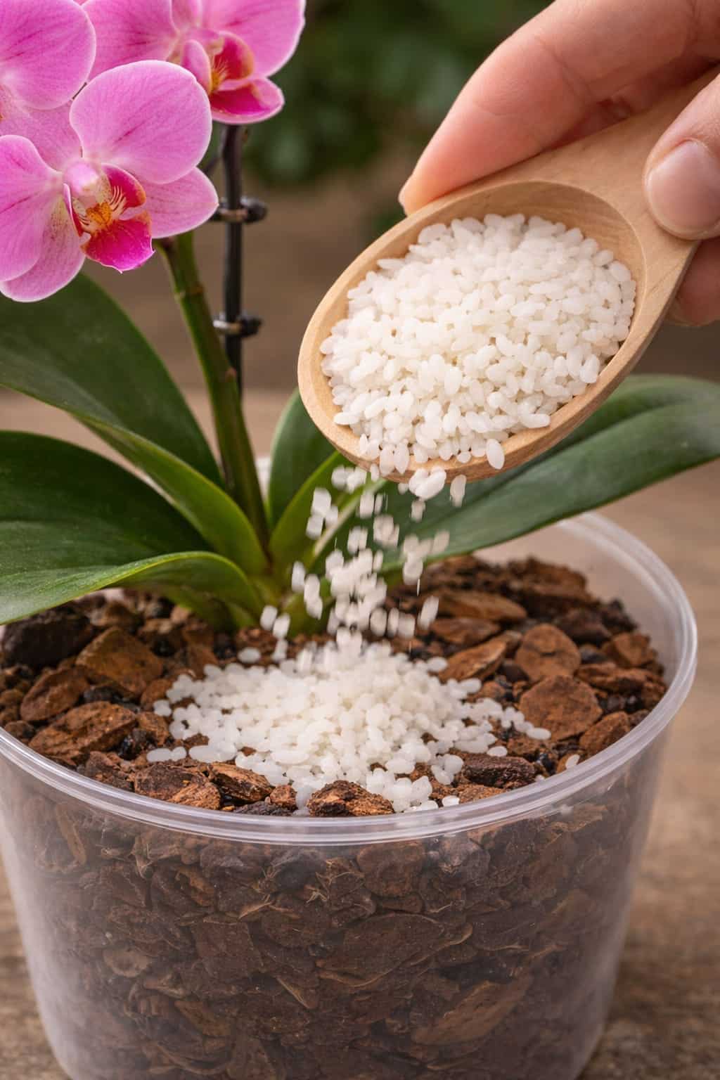Orchid roots need an airy, clean environment. Raw rice works against that. It also provides no benefit that diluted rice water does not already offer — and it comes with significant risks.