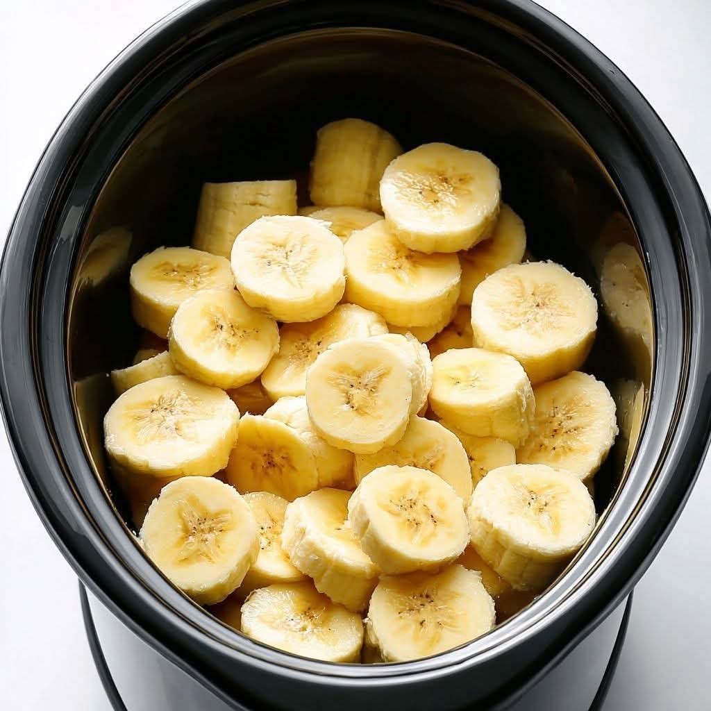 Spread the banana slices evenly across the bottom of the slow cooker.