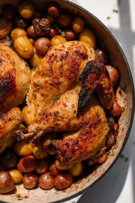 - Put the chicken pieces and potatoes on a serving platter (or leave them on the baking sheet and serve them straight from that) and drizzle a little juice from the slow cooker over the whole thing. Top with chives and serve with lemon wedges.