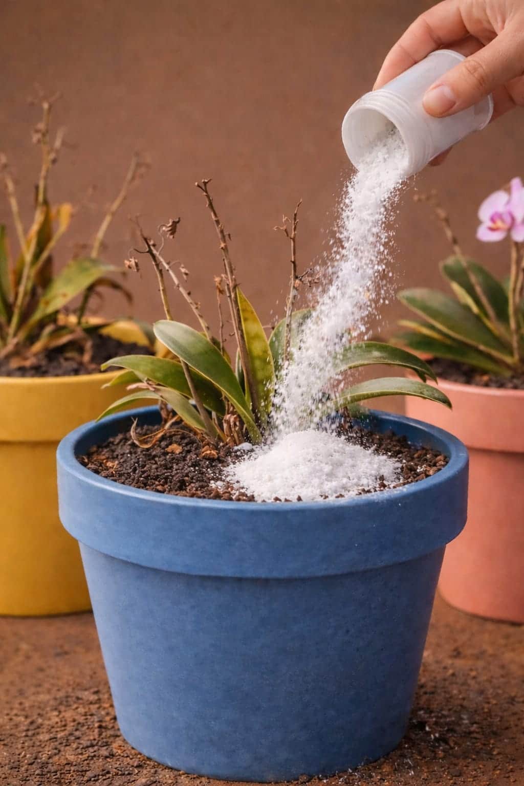 Epsom salt provides magnesium and sulfur. Magnesium is essential for chlorophyll production. If an orchid shows signs of magnesium deficiency (yellowing between leaf veins), a very diluted Epsom salt solution (1 teaspoon per gallon of water) applied once a month may help. But Epsom salt does not cure root rot or revive a dying orchid on its own.