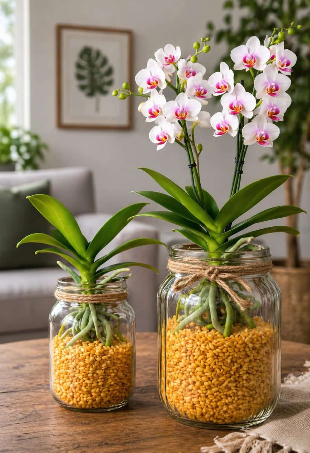 The golden grains are one of the main reasons this method catches attention online. They stand out immediately in a clear jar. Their warm color contrasts beautifully with the green leaves, pale roots, and soft orchid flowers.