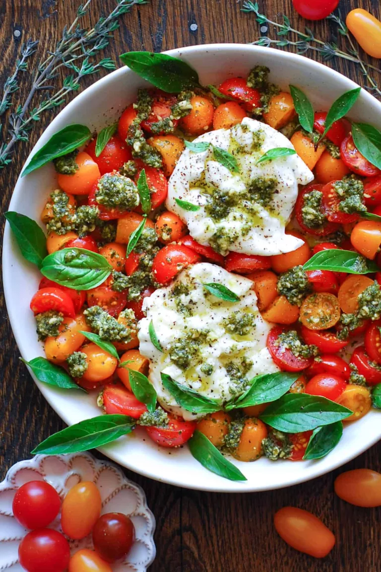 Fresh tomatoes, creamy burrata cheese, fresh basil, and basil pesto are the main ingredients in this 15-minute side dish or …