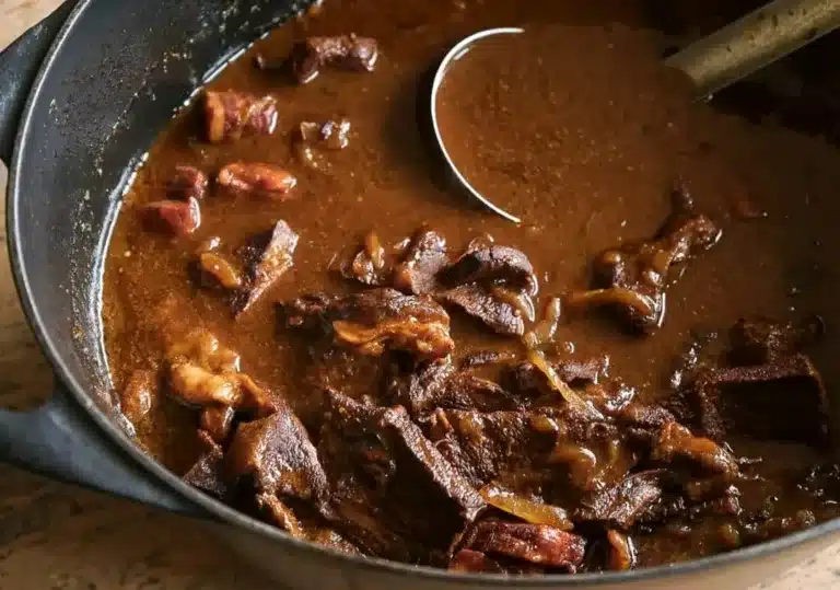 Caçoila, or Portuguese stewed beef, is a comforting dish featuring beef, red peppers, and aromatics slowly cooked in a rich sauce.