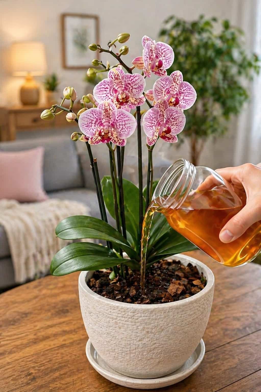 This is why simple orchid care tricks always get attention. One popular method people are starting to notice is the “amber liquid” orchid trick. In photos, a golden-brown liquid is poured gently into the orchid pot, soaking through the bark like a rich natural tonic. It looks warm, nourishing, and almost magical. The color makes it seem like the orchid is receiving a special homemade drink designed to wake up the roots and support more blooms.