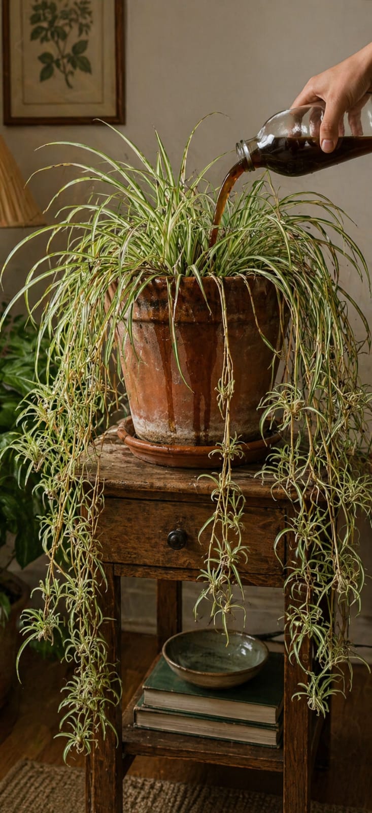 The image shows a dramatic spider plant in a terracotta pot, with long trailing runners and many baby spider plants hanging down like green ribbons. A hand is pouring a dark brown liquid from a bottle into the pot. The liquid runs down the outside of the terracotta, making the scene look rustic, homemade, and powerful. It feels like an old garden trick: a simple brown pour that wakes up a tired spider plant and helps it trail again.