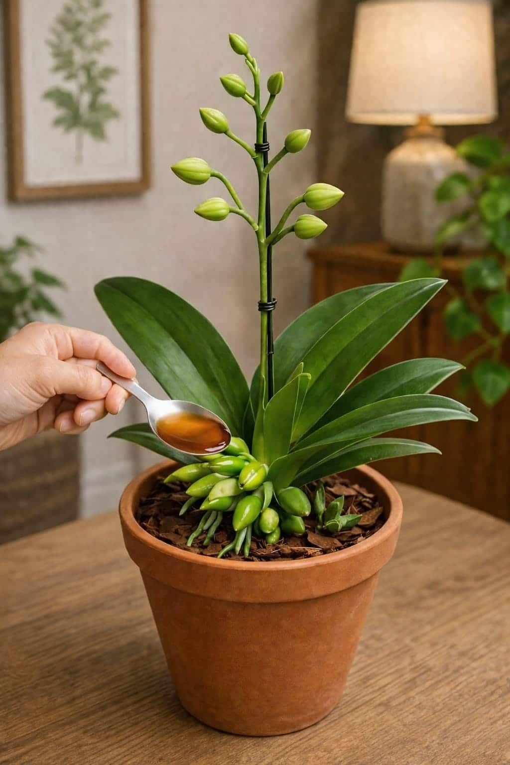Because the orchid is budding, any trick used at this stage must be gentle. A heavy dose of honey or fertilizer can stress the plant. A tiny diluted tonic is the only safe version.
