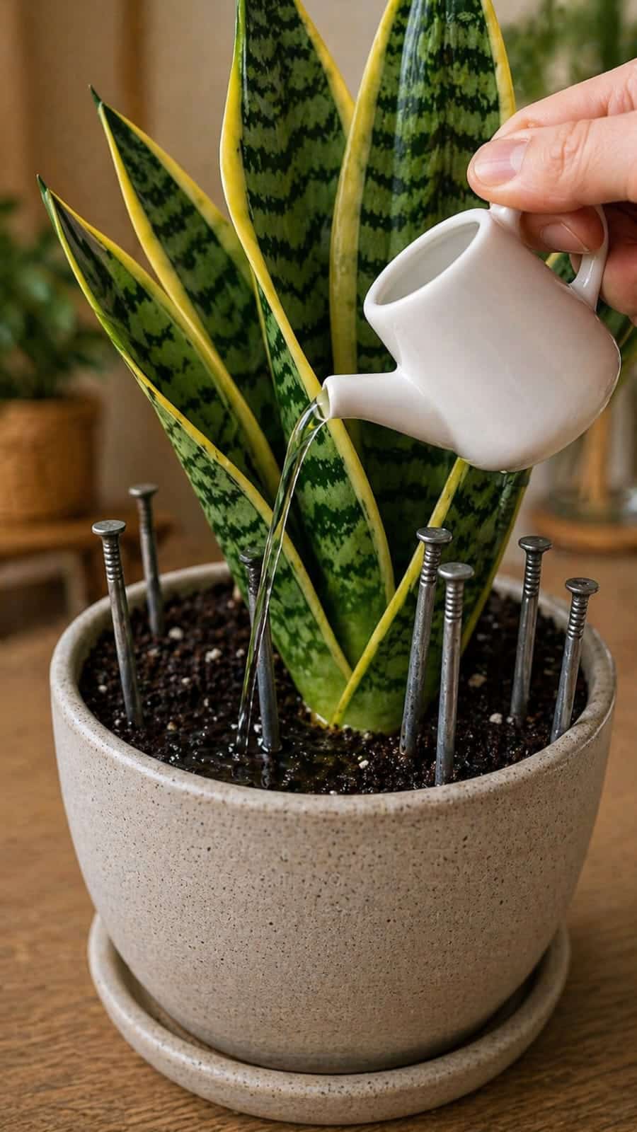 The image shows this idea very clearly. Several nails stand upright in the pot, placed around the snake plant leaves. Water is being poured into the soil near them. The nails make the trick look mechanical, mineral-rich, and almost scientific.