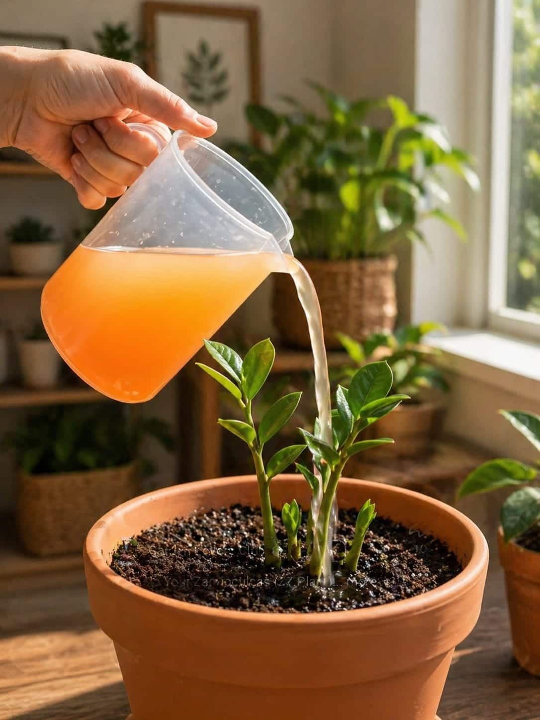 For plants like ZZ plants, moderation is especially important. ZZ plants are tough, drought-tolerant houseplants with thick underground rhizomes that store water. They do not like constantly wet soil. If you pour rich homemade liquid into the pot too often, the roots and rhizomes may rot. The orange liquid trick can be a gentle support only when the plant is already growing in the right conditions: bright indirect light, well-draining soil, and a pot with drainage holes.