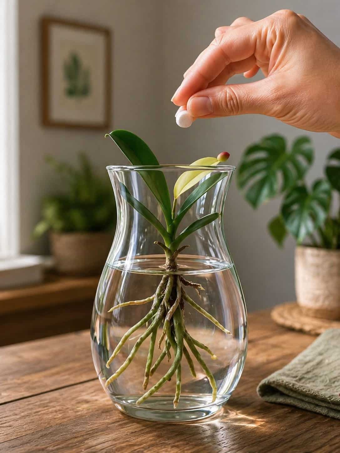It looks effortless. It feels scientific. The image of a clear glass vase, visible roots, and a single tablet being added as a “boost” creates the impression that one simple step will transform your orchid. But is it actually helping your orchid, or is it just another internet illusion?