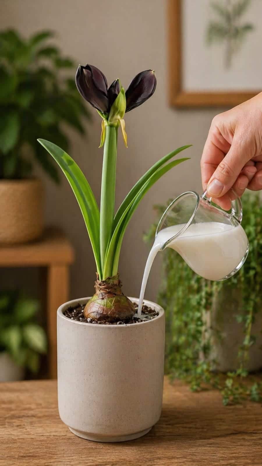 The image is attractive because it combines three things people love about indoor gardening: a dramatic flower bulb, a natural-looking homemade liquid, and a clean modern pot. The white pour makes the scene feel special, almost like the bulb is being fed a secret recipe.
