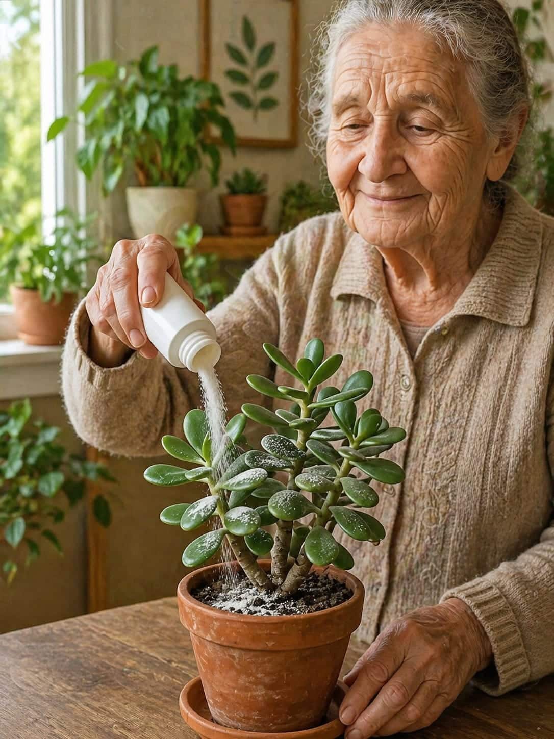 That is why many plant lovers are becoming curious about the simple white powder trick. In the image, a gentle white powder is being sprinkled around the base of a jade plant, almost like an old-fashioned houseplant remedy passed down from someone who has kept plants alive for years. It looks simple, clean, and natural. No complicated fertilizer bottle, no expensive plant spray, no dramatic repotting project — just a small white dusting around the soil.