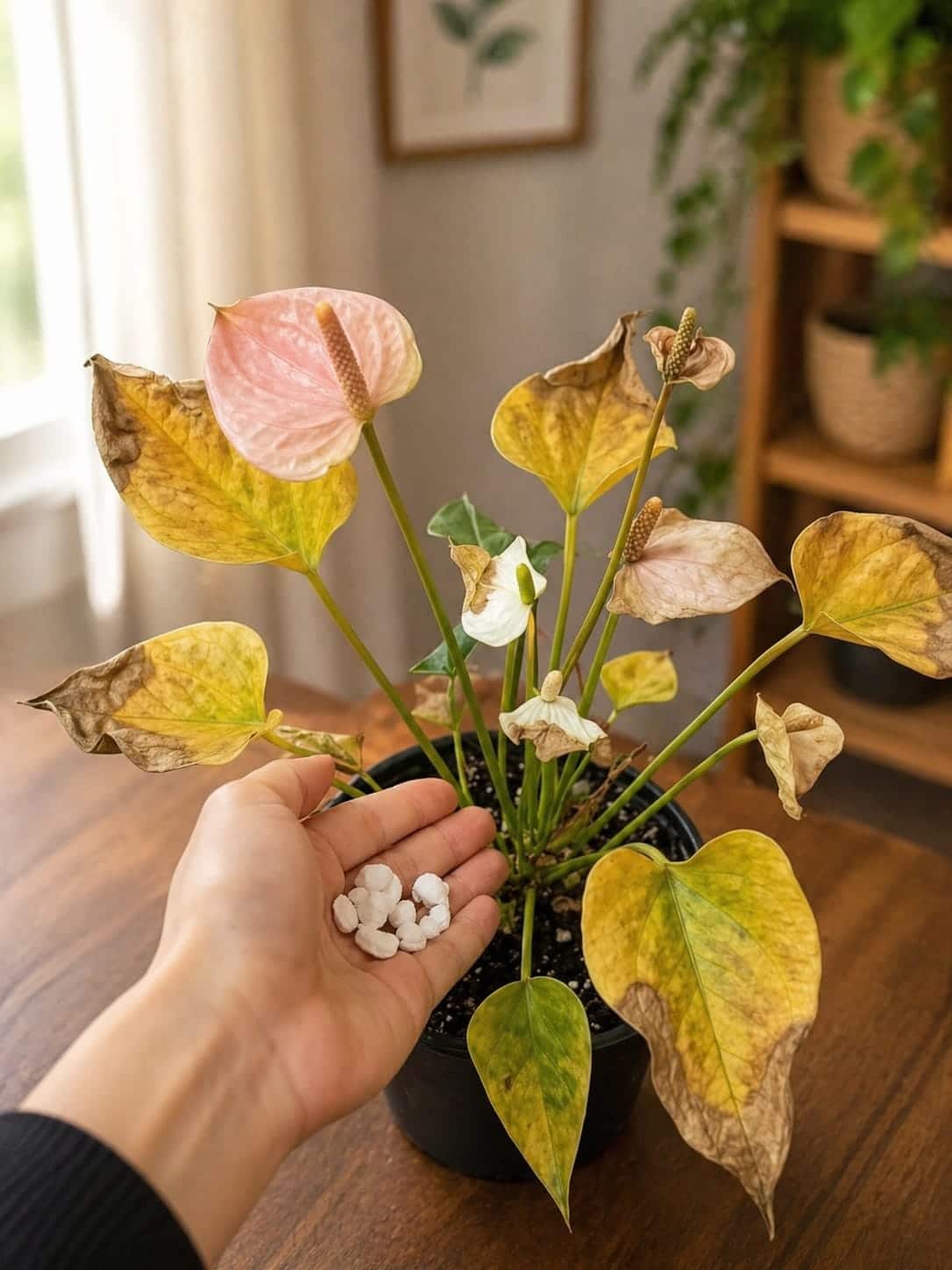 In the image, a hand is holding small white stones near a yellowing anthurium. The plant has pale leaves, brown edges, and fading blooms, which are common signs of root stress, poor drainage, mineral imbalance, or old compacted soil. The little white pieces look simple, but they can represent one of the most useful anthurium care tricks: refreshing the root zone with a light, airy mineral material such as perlite, pumice, or small horticultural limestone chips used carefully.