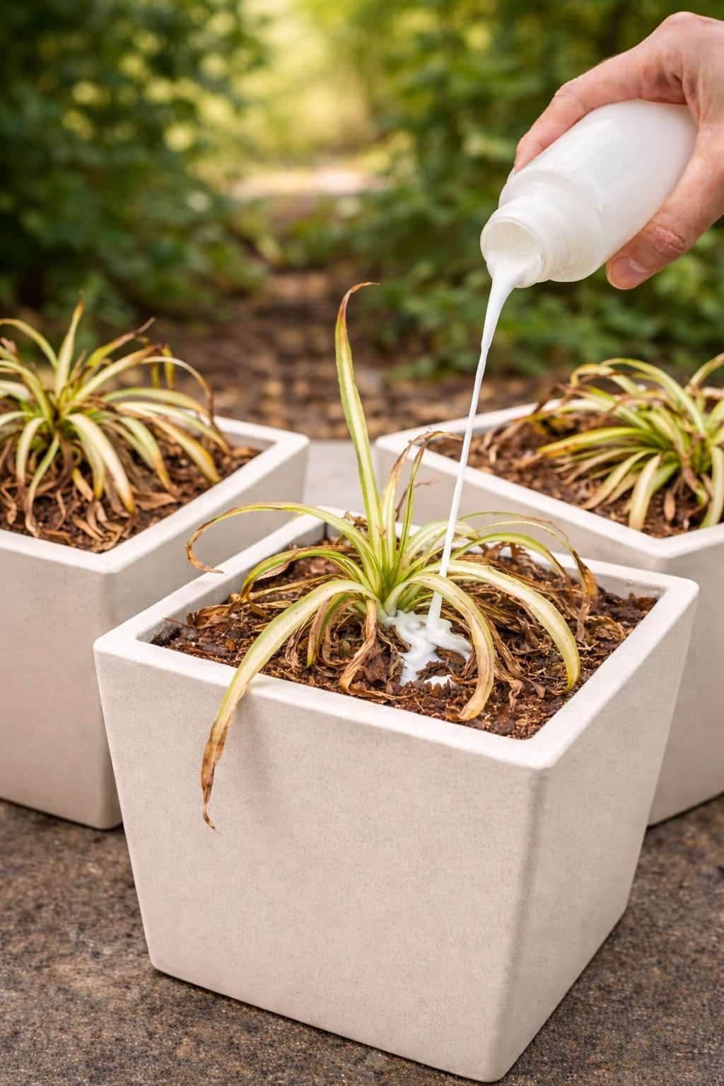 Note on milk: Some viral posts recommend pouring diluted milk on spider plants. While milk contains some nutrients, it can spoil, attract pests, and cause odors. A proper plant‑safe liquid supplement is far more reliable.