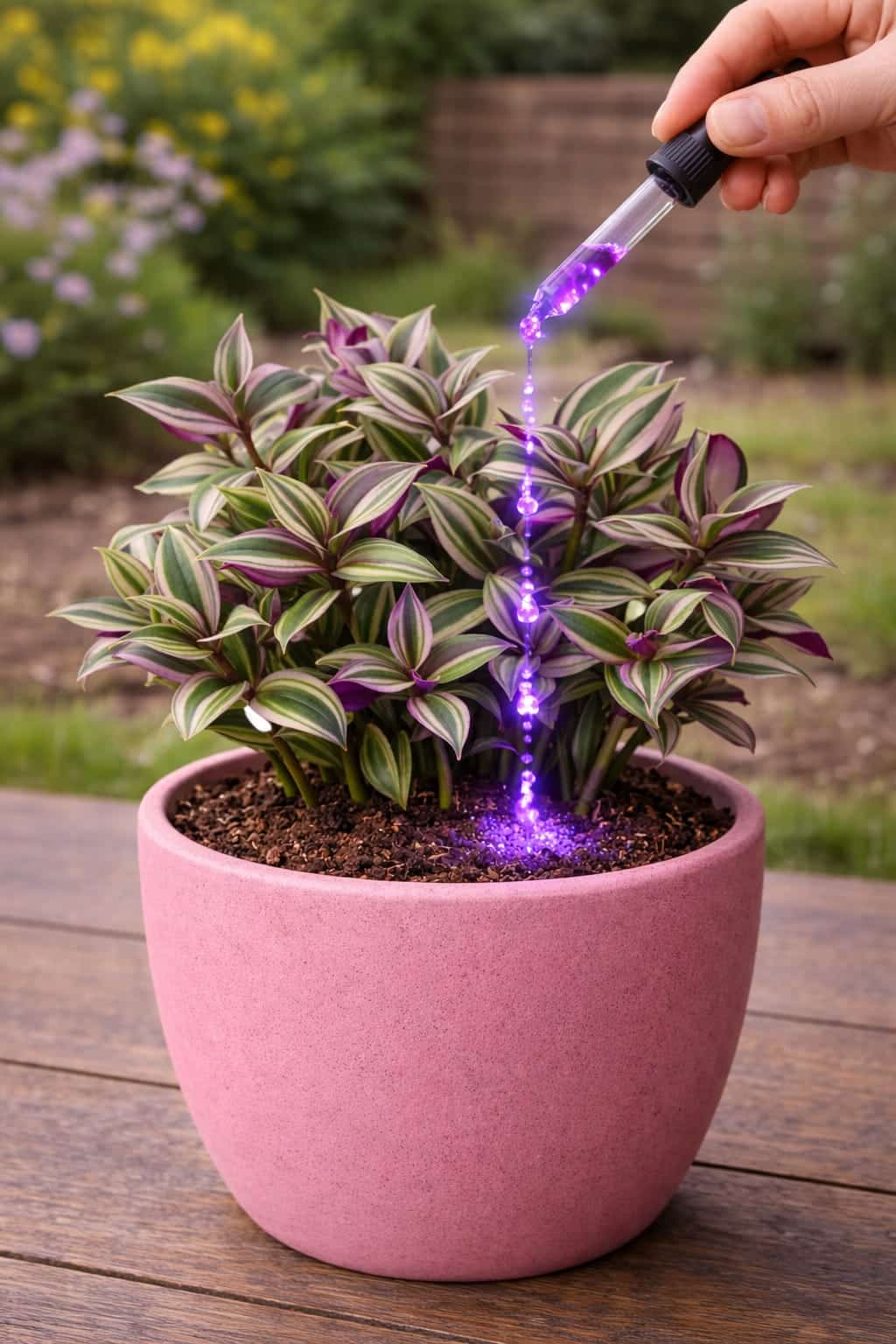 Is your Wandering Jew losing its vibrant purple color? Learn why a purple liquid (diluted fertilizer) can help – but only when light, watering, and pruning are correct. Complete care guide inside.
