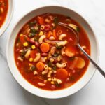 Place the onions, garlic, celery, and carrots in a large pot with 1/2 cup of the vegetable broth. Cook, stirring frequently, for about 5 minutes, until the onions are softened. Add the remaining broth, tomatoes, tomato sauce, potatoes, refried beans, bay leaf, parsley, basil, oregano, and black pepper. Bring to a boil, reduce the heat, cover, and simmer for 25 minutes, stirring occasionally to smooth out the refried beans. Add the kidney beans, corn, and whole wheat elbows. Continue to cook for 20 minutes. Stir in the chard and balsamic vinegar and cook an additional 10 minutes until the chard is softened. Remove the bay leaf before serving.