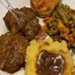 For the mashed potatoes, boil the potatoes in salted water until tender, about 20 minutes. Drain and return to the pot. Add butter, milk, salt, and pepper, and mash until smooth.