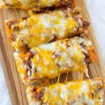 Spoon the beef mixture generously over each slice of garlic bread. Sprinkle with shredded mozzarella cheese.