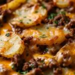 Spread the cooked ground beef mixture evenly over the potatoes.